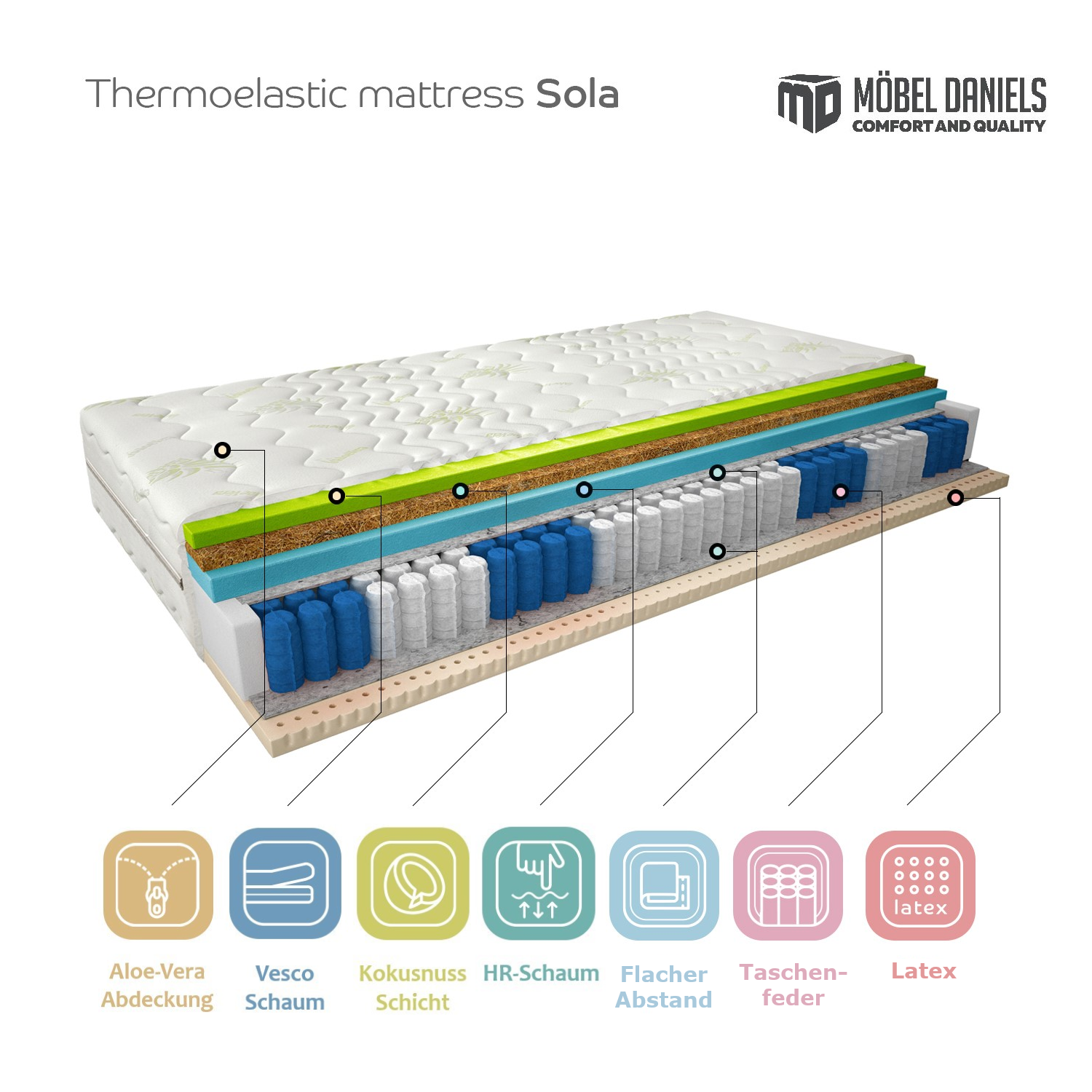 The Sola model is a thermoelastic mattress like no other. What makes it different? The type of filling! In addition to a 2 cm thick layer of viscoelastic foam, which is common for this type of mattress, the Sola model is equipped with a 1 cm thick coconut plate, a C, two protective felt layers above and below the durable pocket springs and a 2 cm thick latex layer that provides adequate elasticity.